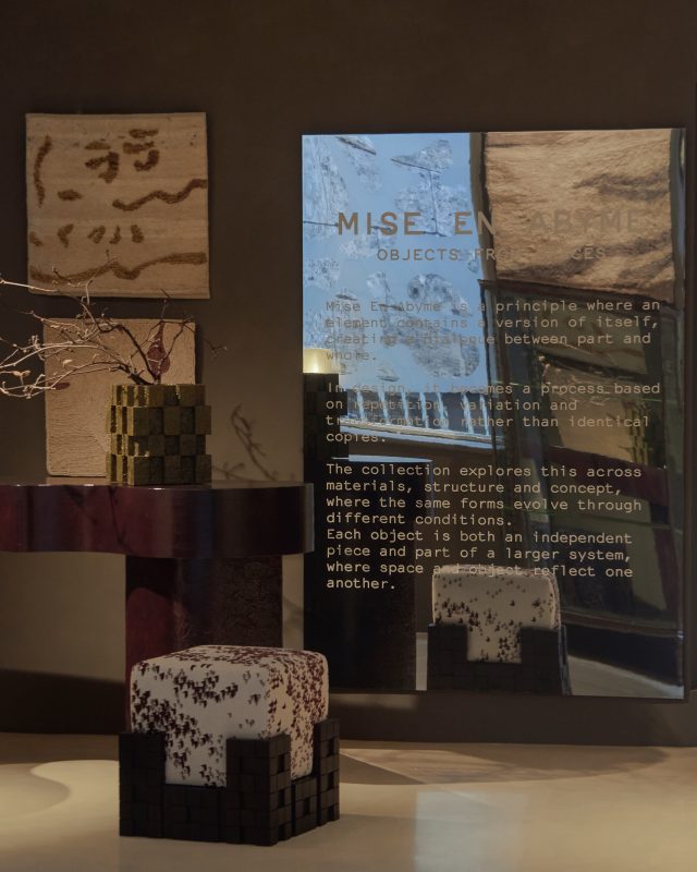 In Mise en abyme la riflessione è prima di tutto materiale. Ogni oggetto contiene un’altra possibile versione di sé, ogni superficie custodisce una trasformazione latente. I pezzi non sono entità isolate, ma frammenti estratti dallo spazio: lo spazio contiene l’oggetto e l’oggetto contiene lo spazio. Ogni elemento è una condensazione del sistema che lo ha generato.