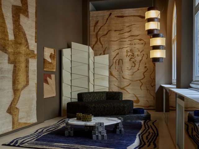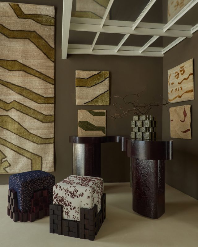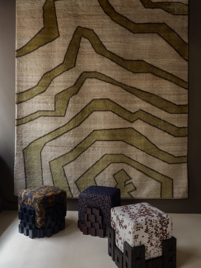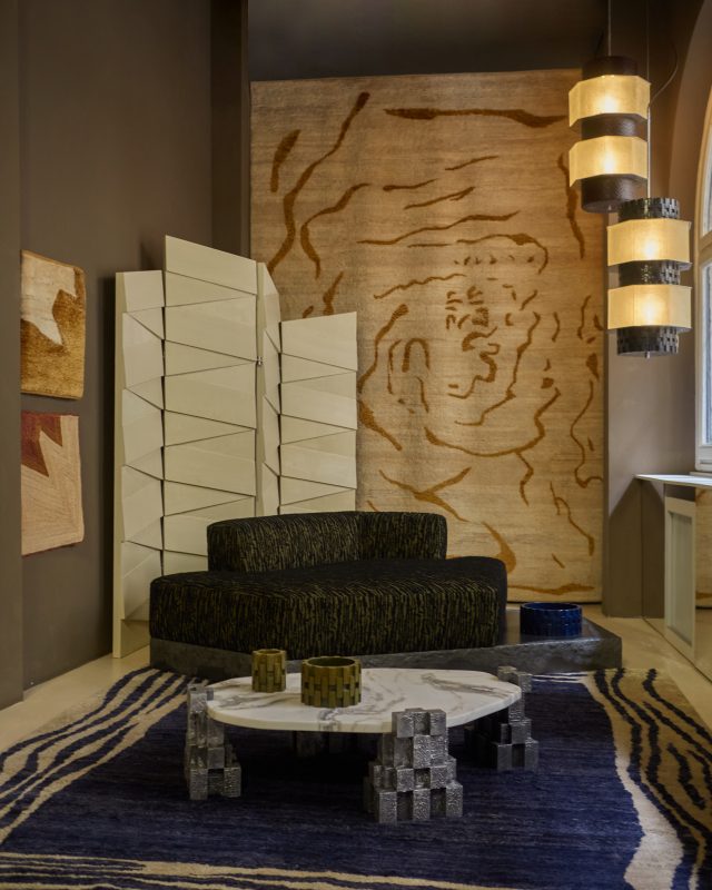 Questa logica prende forma per la prima volta nei tappeti, sviluppati in collaborazione con Alberto Levi Gallery. Ogni disegno è declinato in due condizioni materiche distinte. Nella versione in lana e cashmere, la superficie assorbe e riflette la luce con morbidezza, enfatizzando profondità e tattilità.