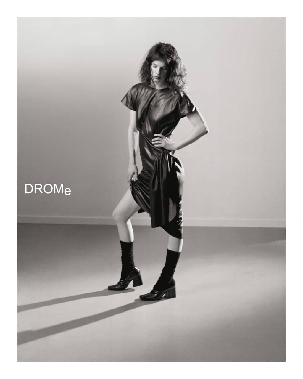 The campaign was shot using film to emphasise the texture of the images, conferring a dreamy ambience and a cinematic aesthetic to the shots. The face of the campaign is well-known model Querelle Jensen, who represents an unconventional idea of beauty and femininity, a confident woman with strong features that perfectly embodies the DROMe world.