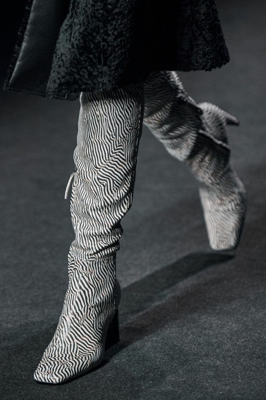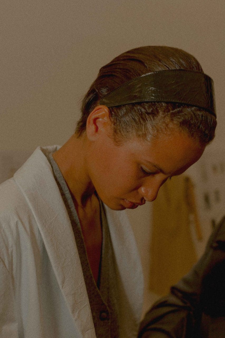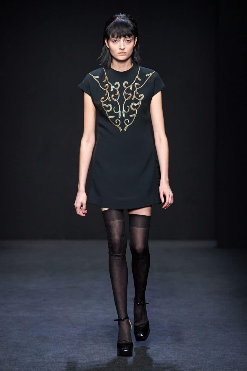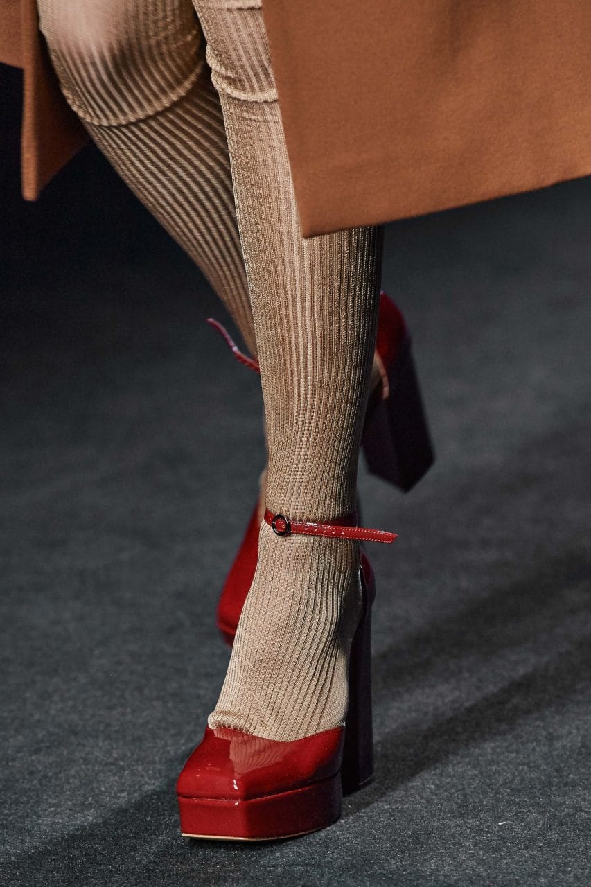 Accessories play a defining role: the fine silk stockings, the printed patent platform shoes with their signature squared toe, the dramatic wide-brimmed hats, the feminine headbands made by different leather and fabrics, the puffy triangular bags. Unexpected accents that add a sense of mystery to the collection.