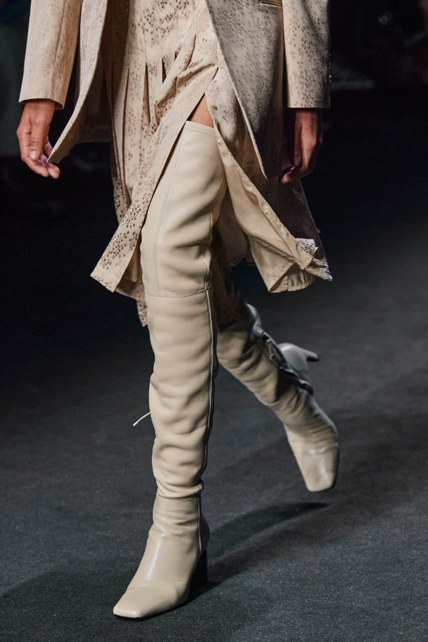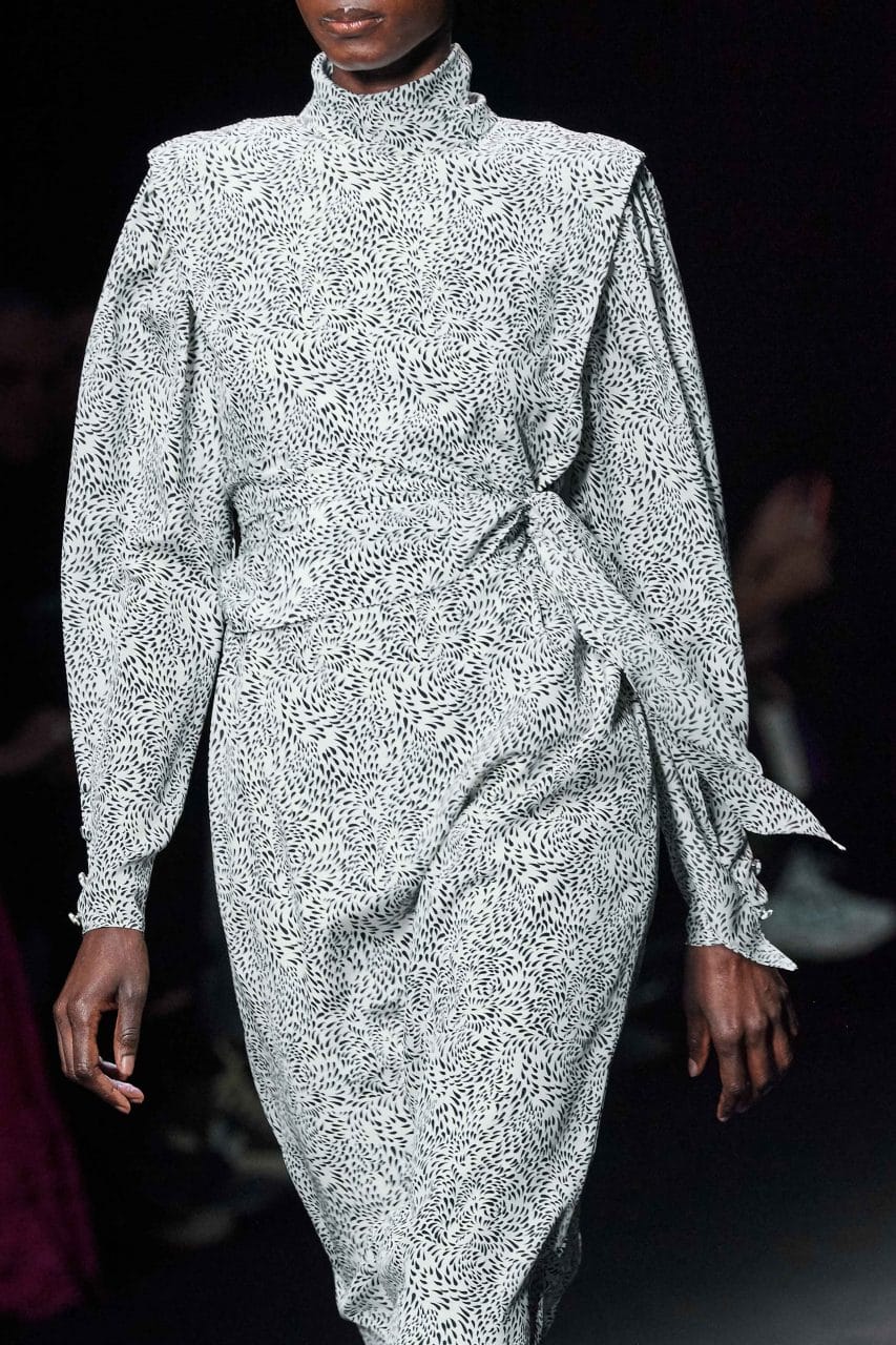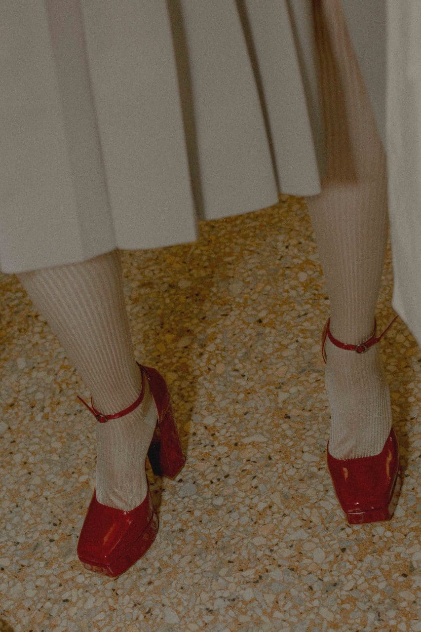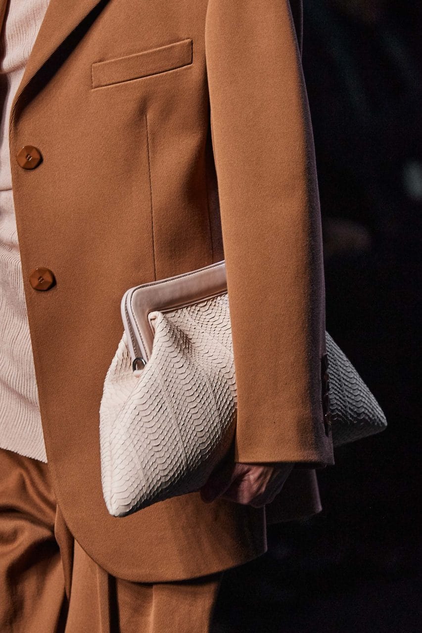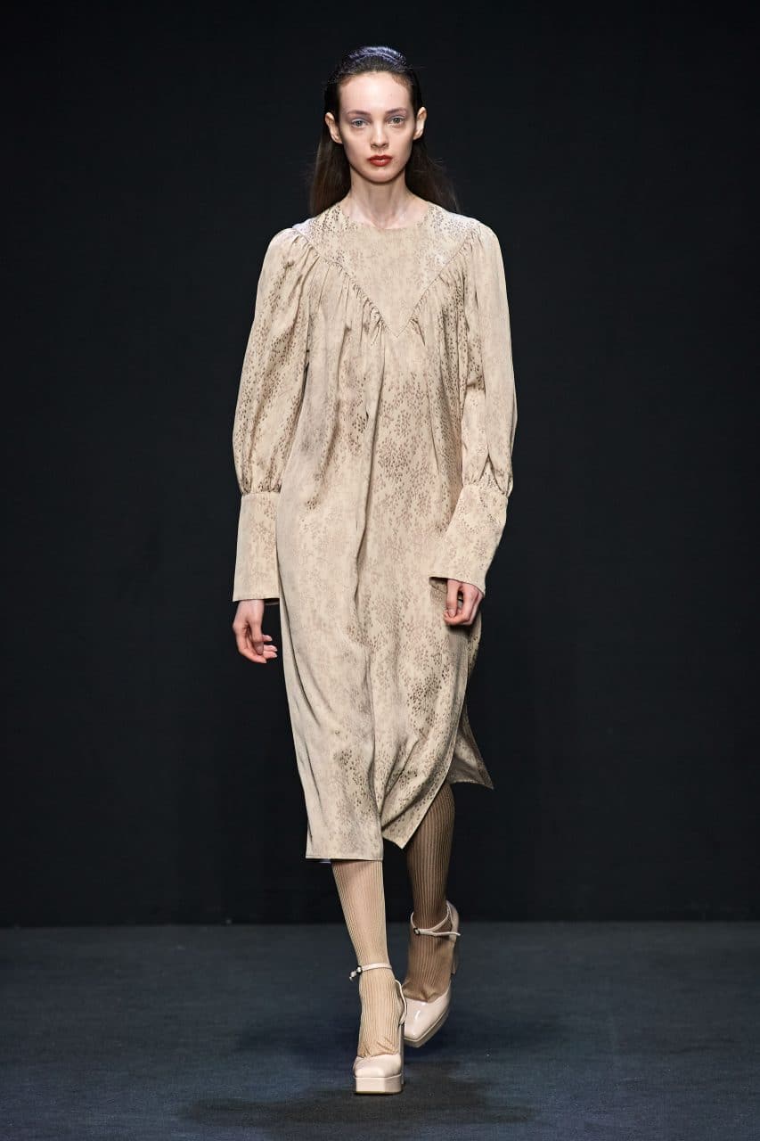 Accessories play a defining role: the fine silk stockings, the printed patent platform shoes with their signature squared toe, the dramatic wide-brimmed hats, the feminine headbands made by different leather and fabrics, the puffy triangular bags. Unexpected accents that add a sense of mystery to the collection.
