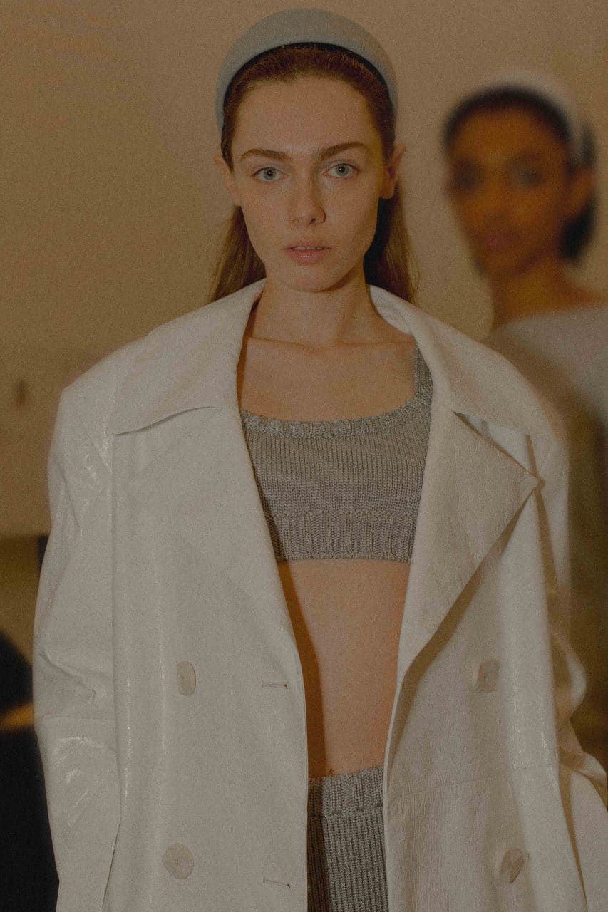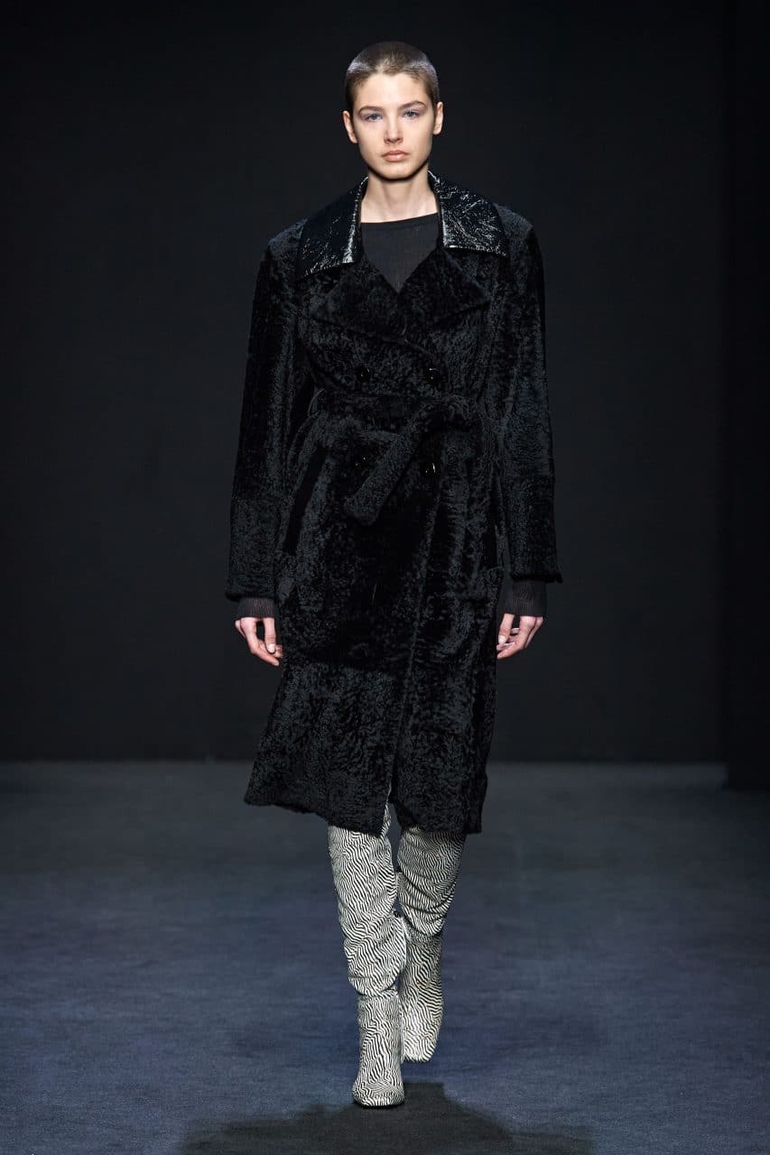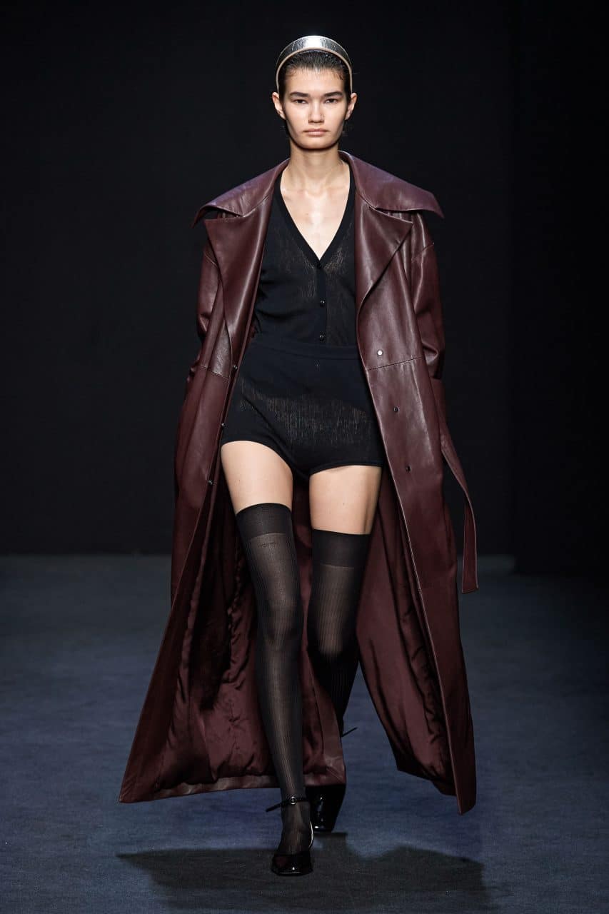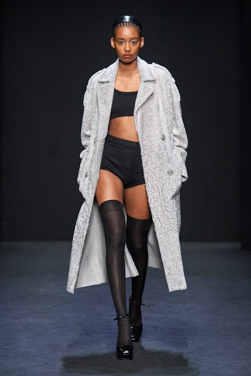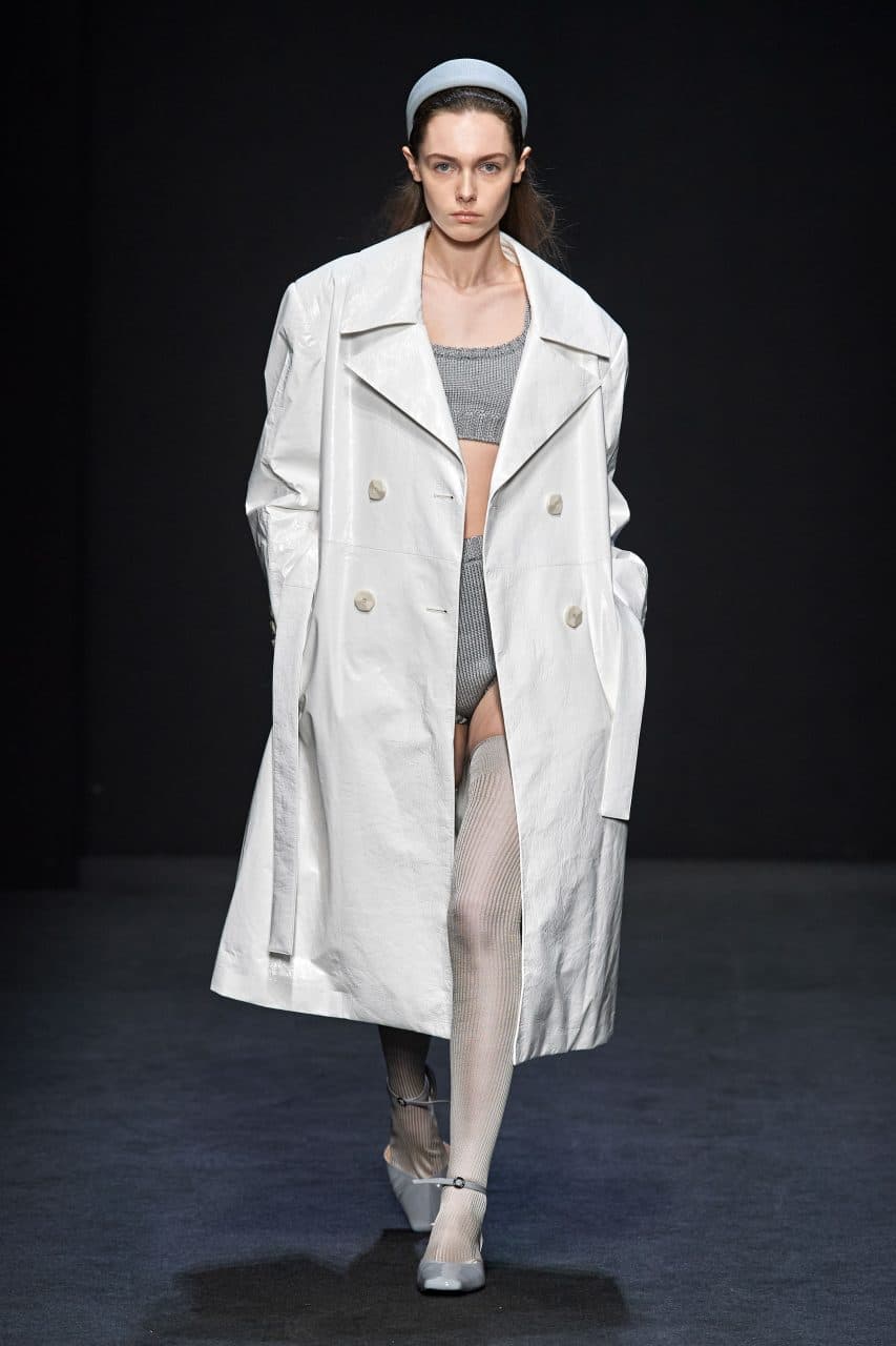 Each look involves a contrast: male oversized coats and jackets are combined with cropped volumes and mini dress with deep side slits, tough surfaces alternate with airy transparent fabrics, squared cuts are balanced by refined features, such as light ribbed knitwear and delicate retro inspired lingerie. The lines recall the late eighties/early nineties, but with a minimalist and essential approach. The protagonist of the collection affirms her sensuality by accepting and unveiling all her contradictory innerworlds.