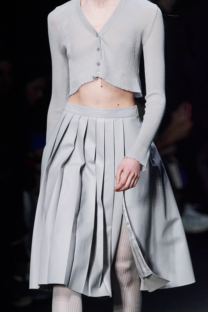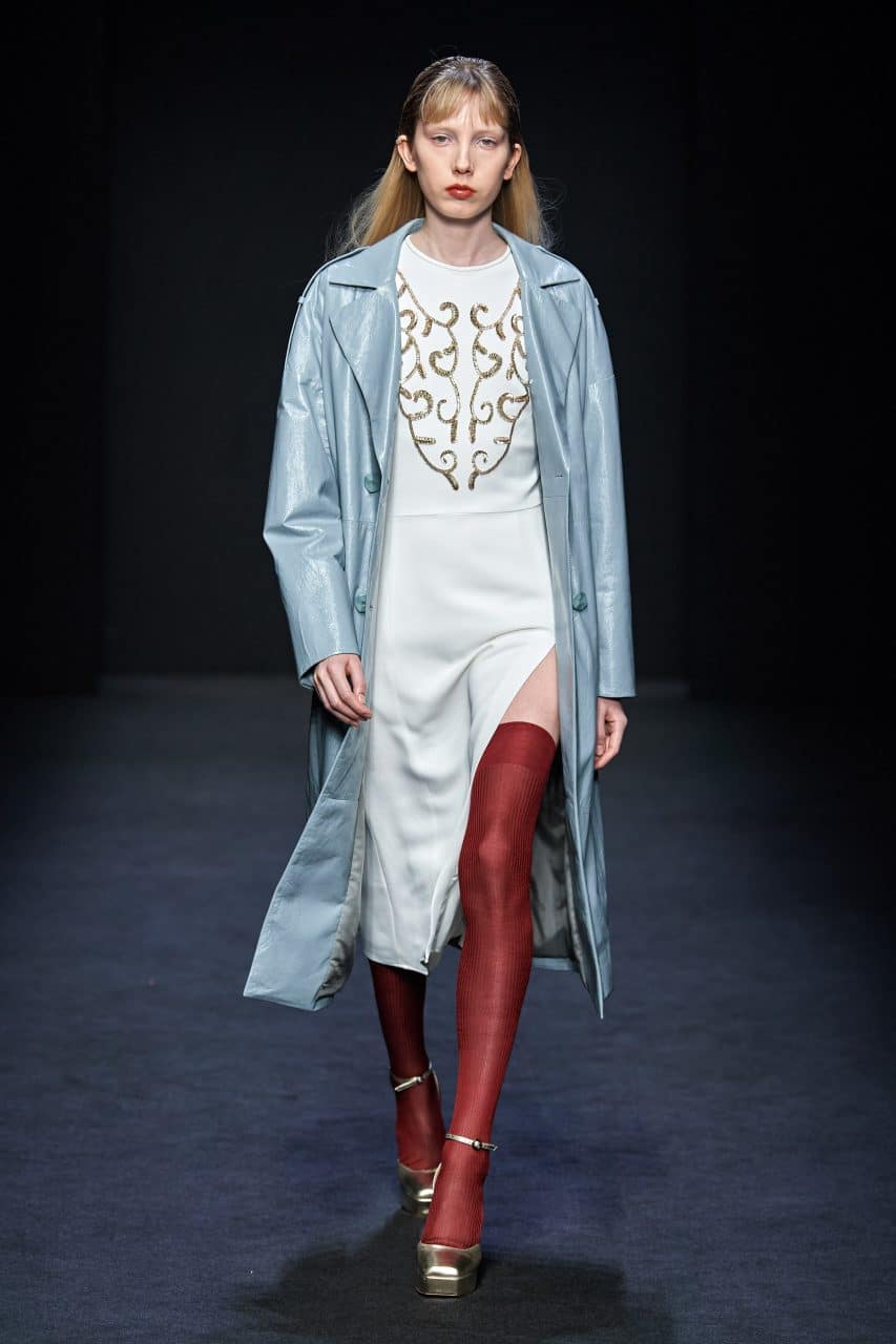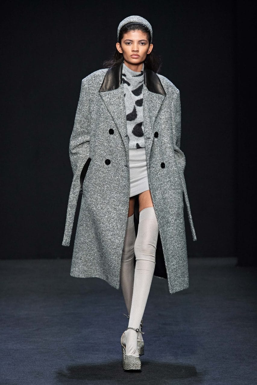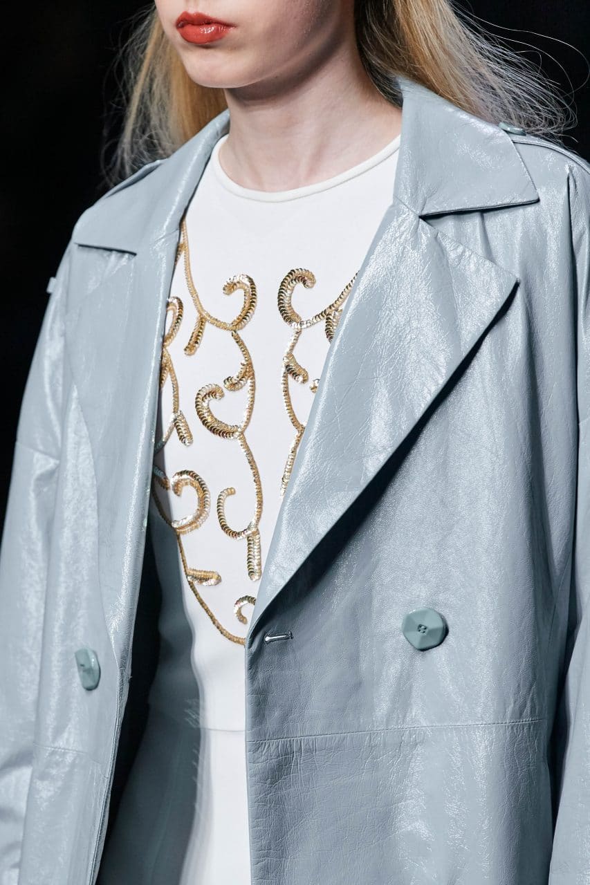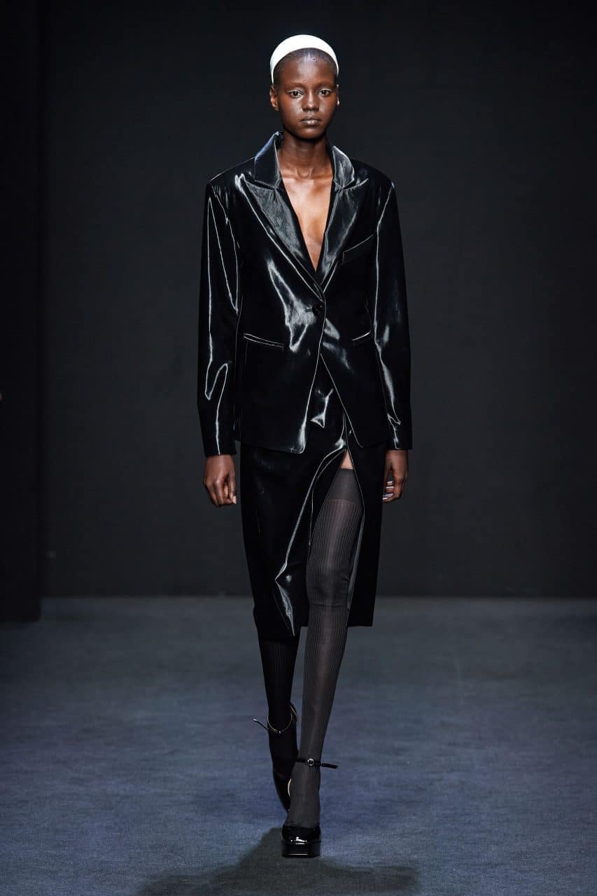 Each look involves a contrast: male oversized coats and jackets are combined with cropped volumes and mini dress with deep side slits, tough surfaces alternate with airy transparent fabrics, squared cuts are balanced by refined features, such as light ribbed knitwear and delicate retro inspired lingerie. The lines recall the late eighties/early nineties, but with a minimalist and essential approach. The protagonist of the collection affirms her sensuality by accepting and unveiling all her contradictory innerworlds.