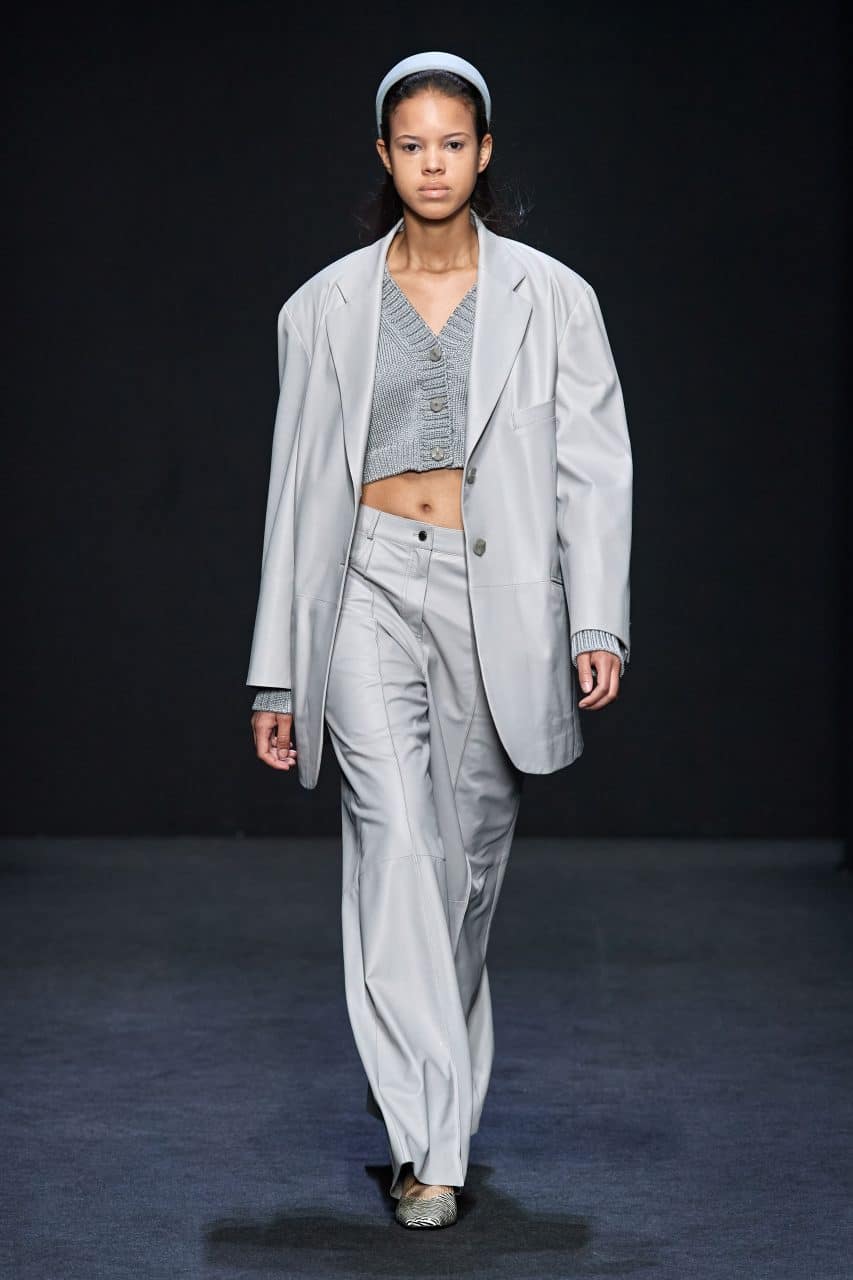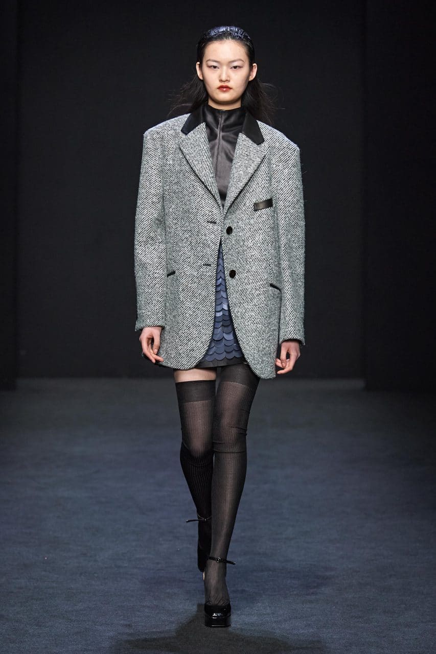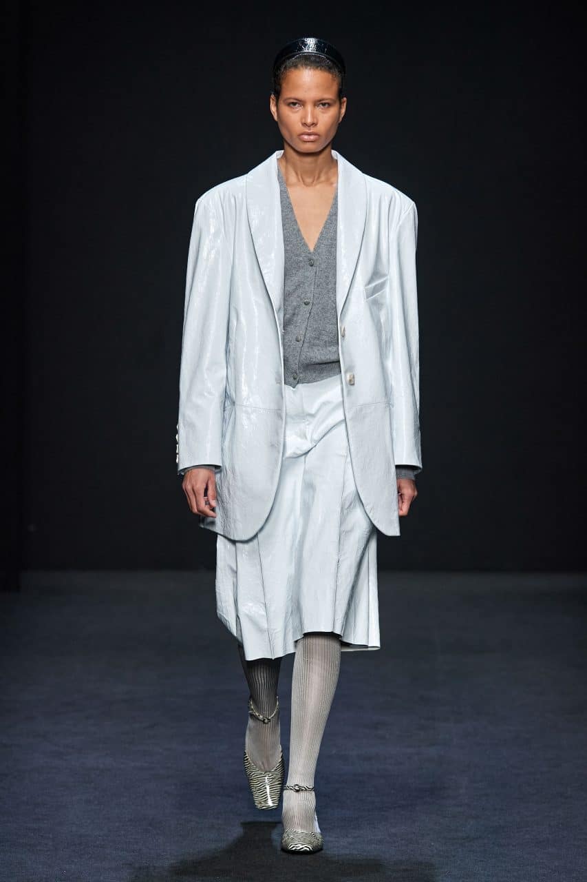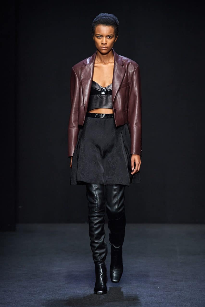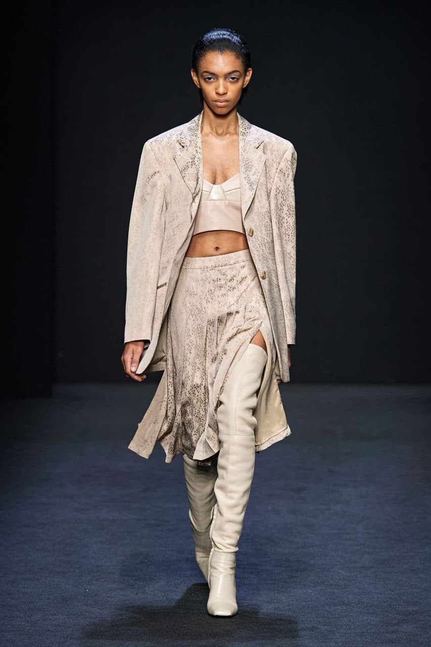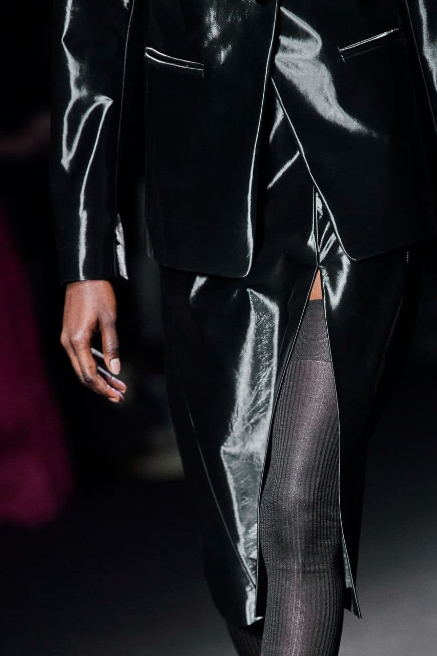 Each look involves a contrast: male oversized coats and jackets are combined with cropped volumes and mini dress with deep side slits, tough surfaces alternate with airy transparent fabrics, squared cuts are balanced by refined features, such as light ribbed knitwear and delicate retro inspired lingerie. The lines recall the late eighties/early nineties, but with a minimalist and essential approach. The protagonist of the collection affirms her sensuality by accepting and unveiling all her contradictory innerworlds.
