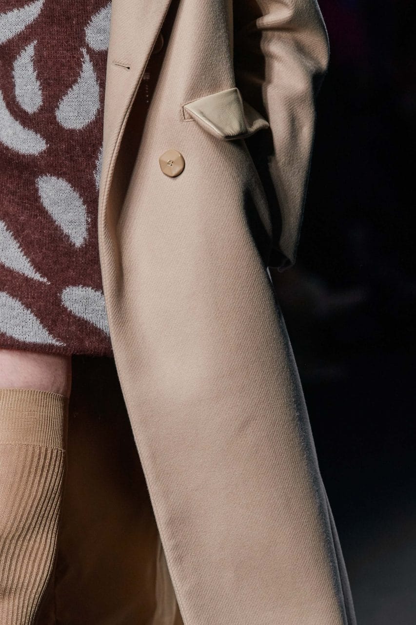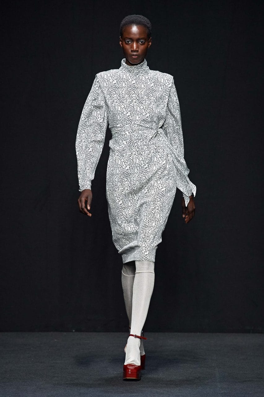 Colours are hazy and opaque, a foggy palette made by neutrals and marked by a bitter black, enlightened only by flashes of pure white and gold. The two key patterns are an optical print shaped by small drops, and the one designed with the artist Klaus Jurgen Schmidt, made by maxi wrinkled stripes.