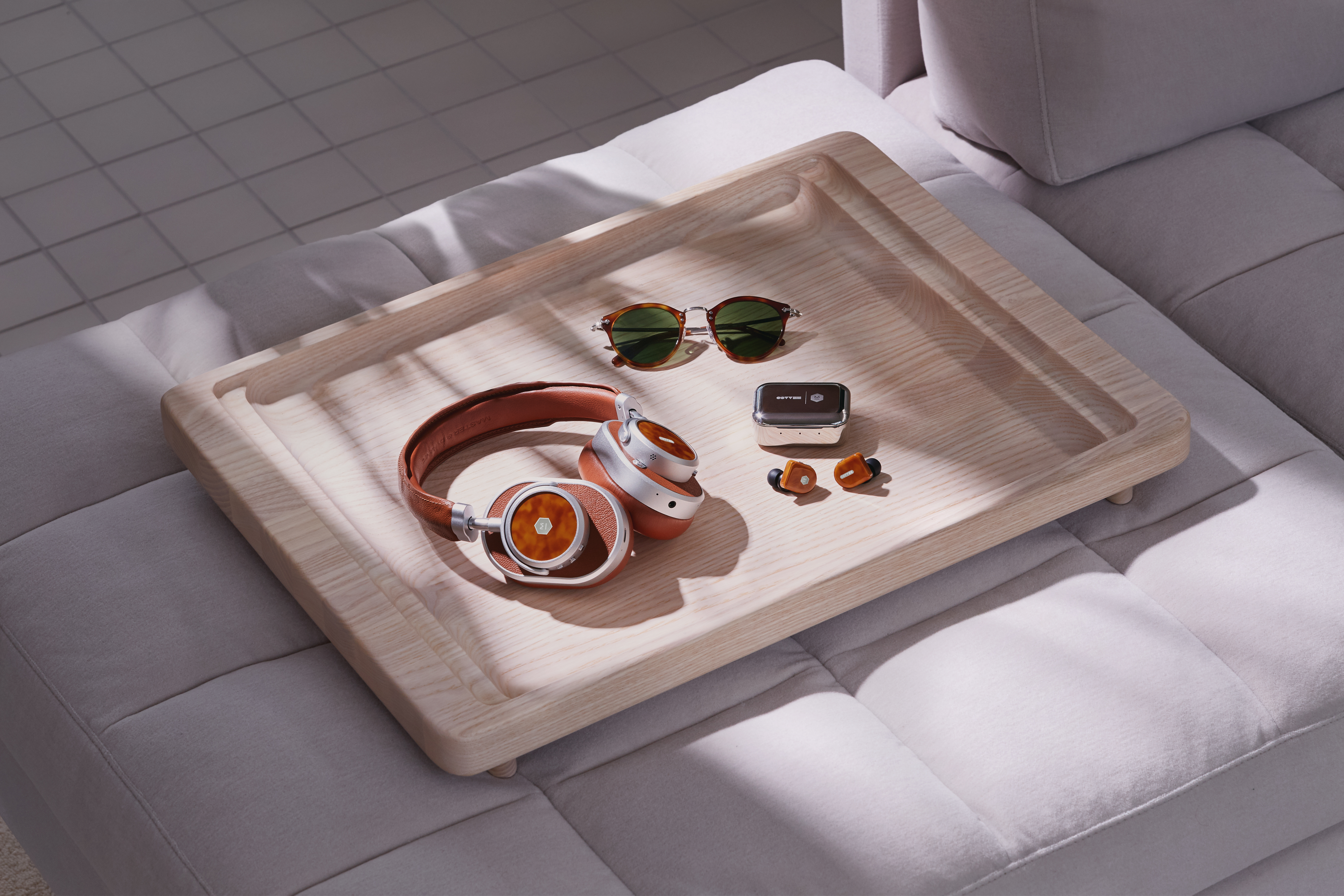 The collection includes three custom Oliver Peoples acetates featured on exclusive editions of the OP-505 sunglasses and Master & Dynamic’s MW65 Active Noise-Cancelling Wireless Headphones and MW07 PLUS True Wireless Earphones.