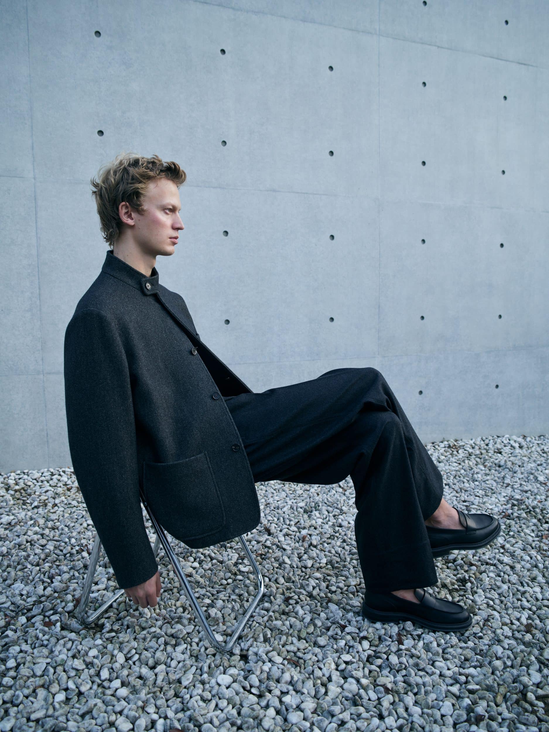 Soffuse di luce naturale che esalta le qualità materiche sia degli abiti che dell’ambiente, le immagini mostrano ogni soggetto da solo: mentre cammina per strada o in piedi sulla battigia, seduto in un campo, appoggiato ad architetture moderne e tradizionali. Il Giappone si sente chiaramente, ma nella ricerca di armonia è anche solo un accenno, un suggerimento, una traccia. Il senso di comunità, di pace con l’ambiente percorre tutto: i gesti fluiscono, mentre i colori e le texture dei capi si armonizzano naturalmente con quelli dello spazio circostante. L’umanità trova il suo posto nella natura, esplorando un sentimento di interconnessione, con abiti e accessori che stimolano tale consapevolezza. Pittoriche e dense, le immagini emanano un senso di gioia, calore e pace.