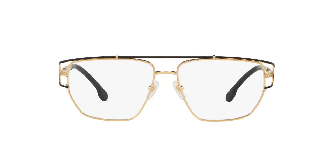 Gli elementi di spicco di questo modello da vista maschile sono il motivo Greca e il medaglione Medusa sulle parti finali delle aste. La struttura metallica a cerchio aperto vanta un doppio ponte con effetto “clip-on”, mentre le aste incise a laser con motivo Greca sono impreziosite dal medaglione Medusa in corrispondenza dei terminali. Questo modello da vista si compone di montatura dorata con finali asta e doppio ponte in metallo nero opaco.