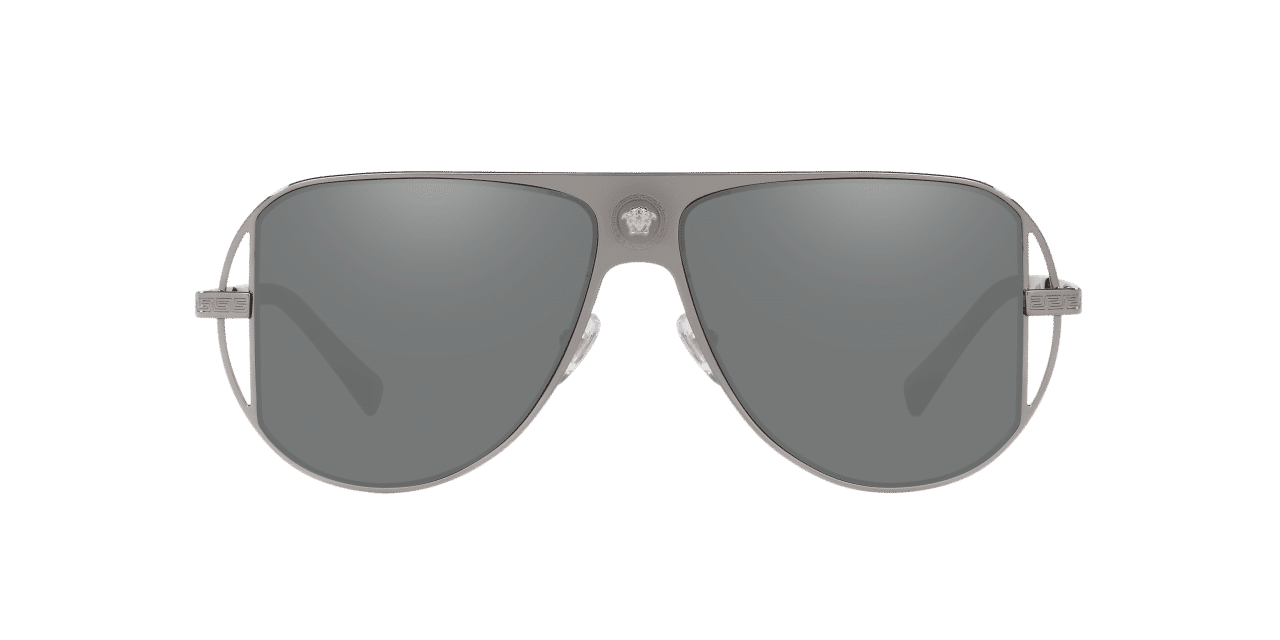 Un occhiale in metallo flat con frontale definito e intagli laterali. I tratti distintivi sono il medaglione Medusa sul ponte e il motivo Greca inciso a laser sulle aste in metallo. Il modello è disponibile in argento scuro con dettagli canna di fucile e lenti a specchio grigie.