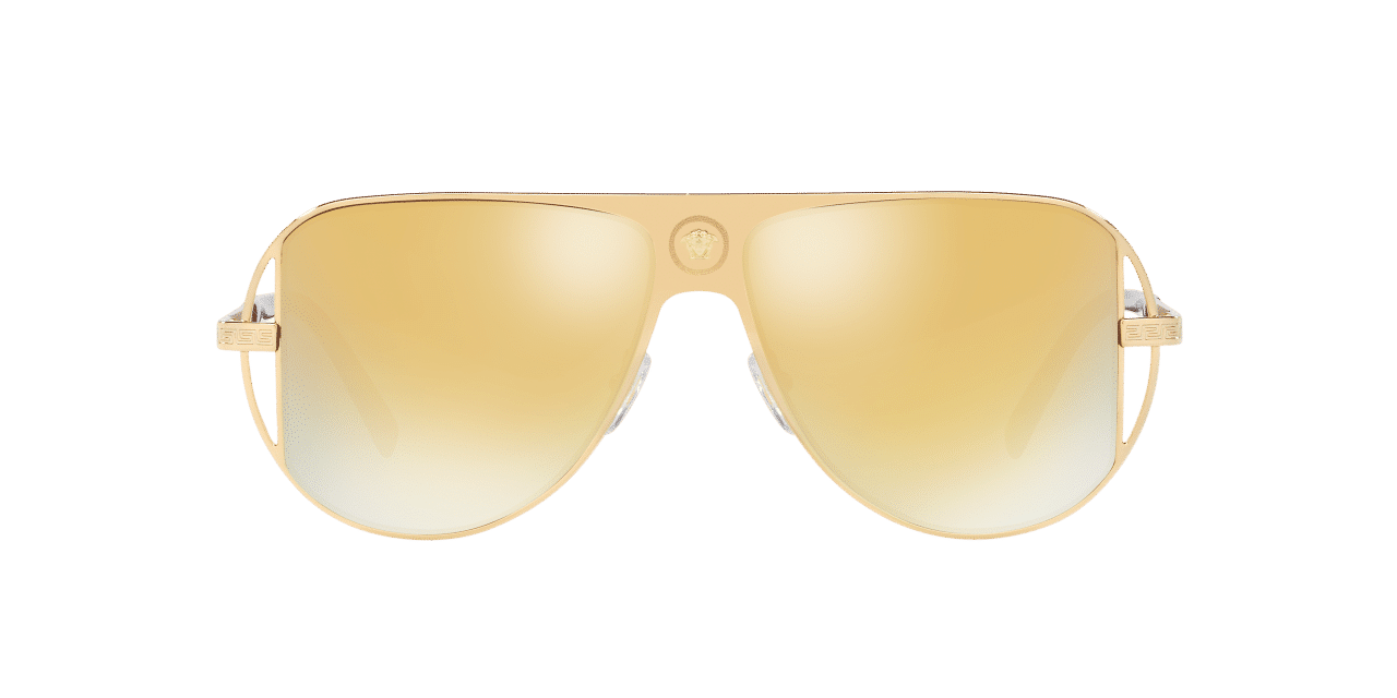 Questo modello da sole a mascherina si distingue per il frontale ben definito e gli intagli laterali. Il ponte è arricchito dal medaglione Medusa, mentre le sottili aste metalliche sono impreziosite dal motivo Greca inciso a laser. Questi occhiali da sole dalla speciale silhouette si declinano in una palette cromatica sui toni dell’oro con dettagli dorati e lenti grigie.