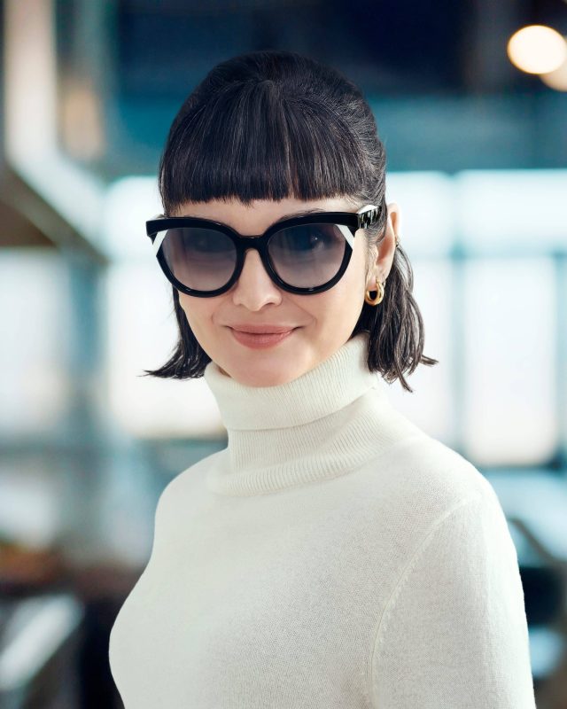 Nella campagna indossa il modello Aleksandra (SYA214 colore 700), un occhiale da sole in acetato con frontale a forma cat-eye, arricchito da raffinati incollaggi sia sul frontale che sulla parte superiore delle aste.