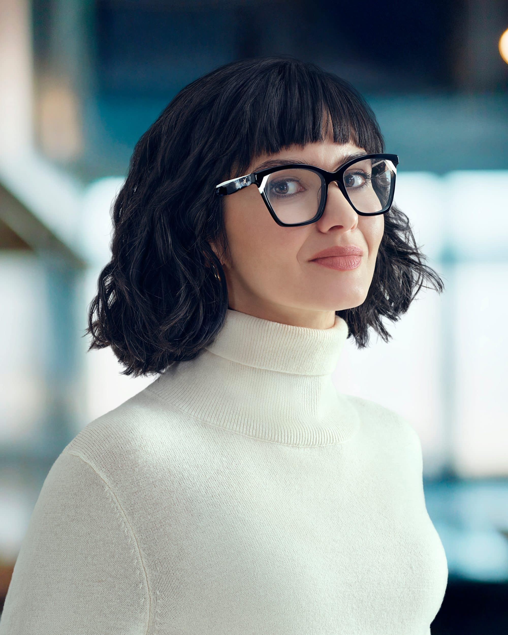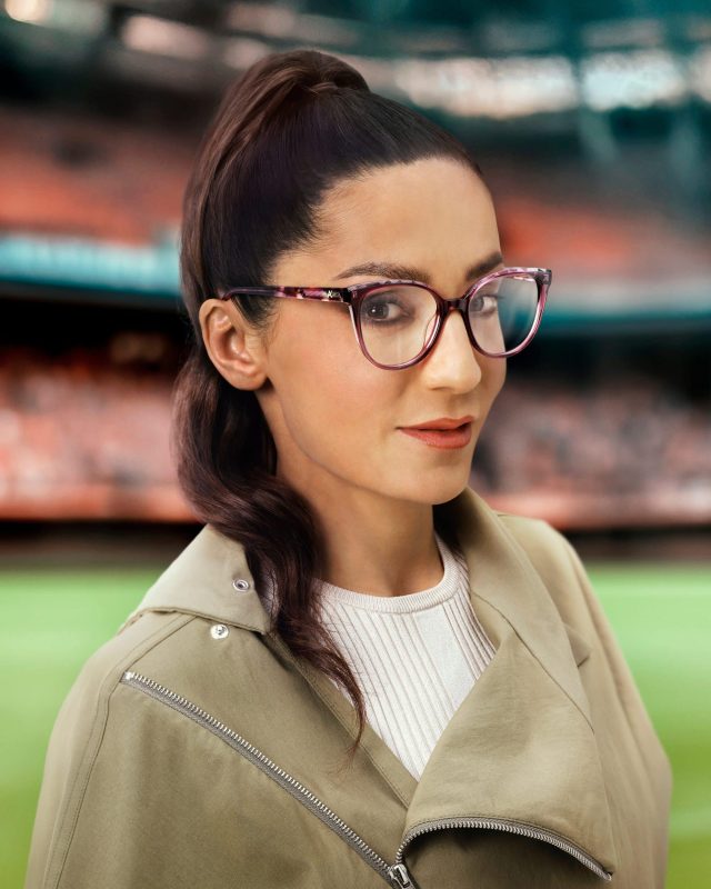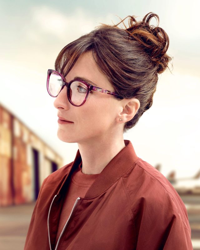 In un altro scatto della campagna, Maria indossa invece il modello da vista Lola (VYA203 colore NKZ), che si contraddistingue per il frontale geometrico realizzato tramite l’accostamento di sottili strati di acetato trasparente. I contrasti bicolor su frontale e aste, che uniscono tonalità solide a nuance trasparenti, insieme alla particolare forma delle aste, conferiscono all’occhiale un’eleganza contemporanea e ricercata.