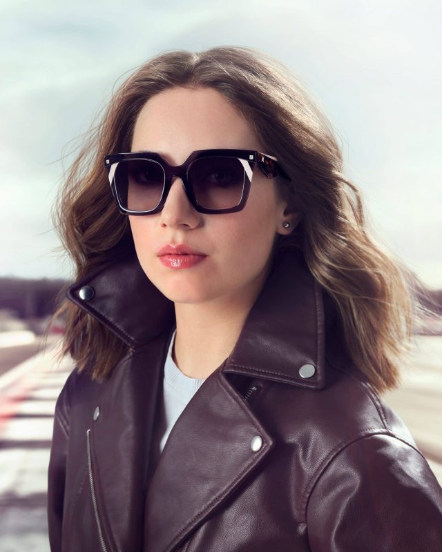Nella campagna, indossa il modello Etty (SYA221 colore 1BZ), un occhiale da sole squadrato in acetato, con frontale arricchito da sfaccettature leggere ed eleganti effetti a incisione lungo la parte superiore della montatura. L’acetato trasparente si unisce a terminali colorati, creando un look deciso ma fresco.